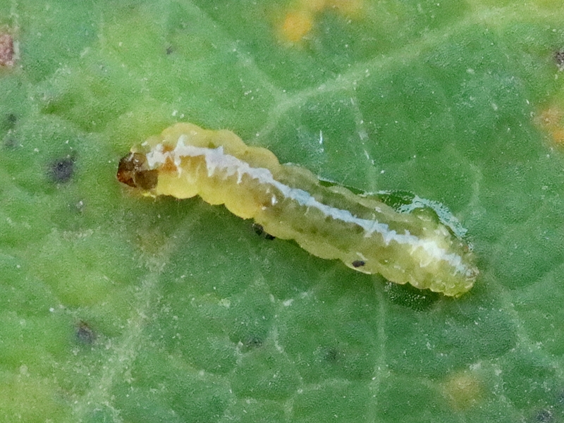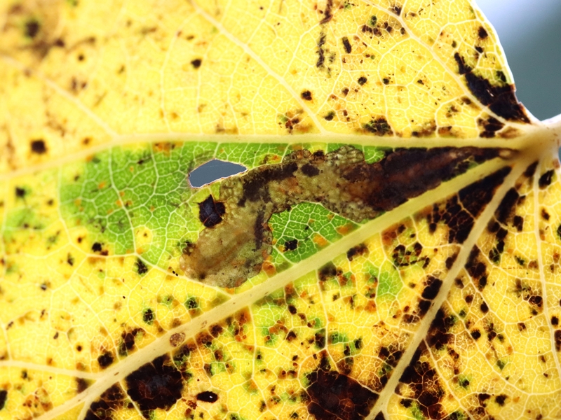 Observations : Espèce univoltine. Ponte sur le pétiole à 1cm de la base de la feuille. La chenille creuse une galerie dans le pétiole ce qui provoque un léger gonflement. Les excréments forment deux bandes parallèles à la base de la feuille. Chenilles visibles de septembre à novembre. La chenille hiverne au sol dans un cocon de soie. Nymphose au printemps.