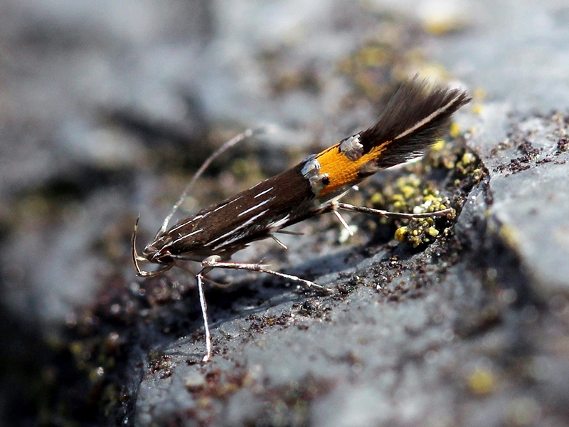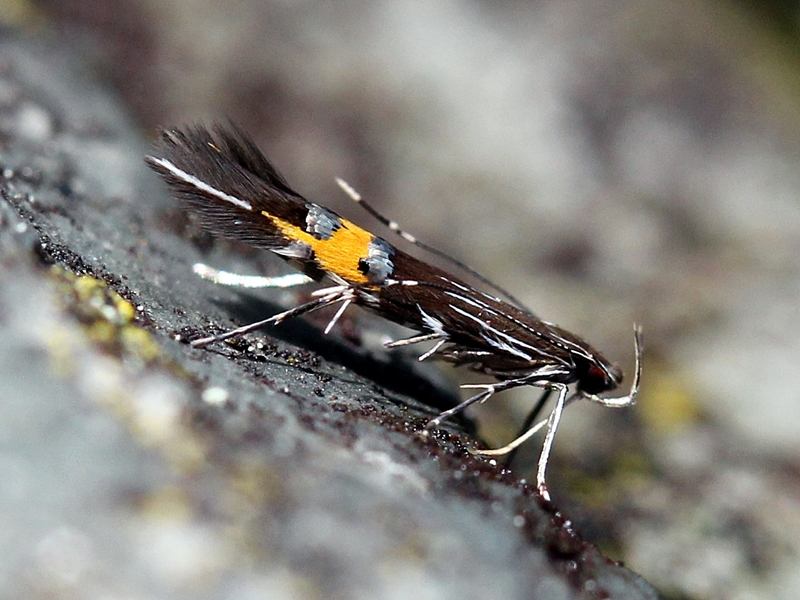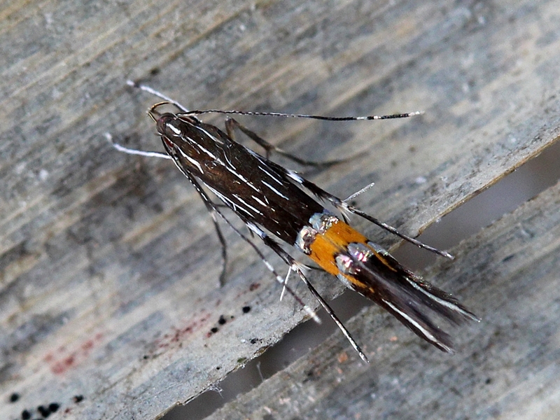 Espèces ressemblantes : Cosmopterix pulchrimella, C. orichalcea, C. zieglerella, C. schmidiella. scribaiella => Fines bandes blanches sur la partie basale de l'aile antérieure et une longue bande blanche bien visible au bout de l'aile. |