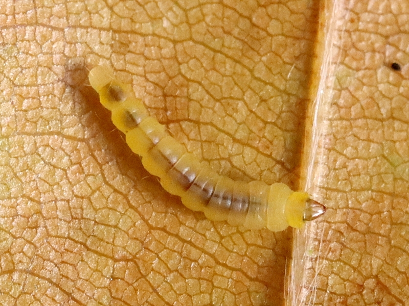 Observations : Espèce bivoltine. Oviponte sous la feuille près d'une nervure. La mine tentiforme est allongée entre 2 nervures latérales. L'épiderme de la mine présente de nombreux replis fins. les excréments sont accumulés dans un coin. Chrysalide dans un cocon blanc et lâche.