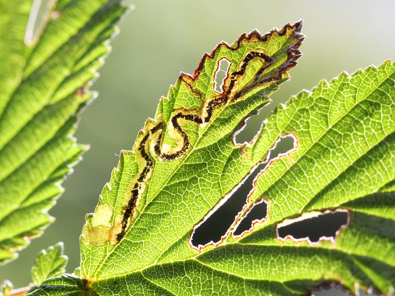 Observations : Espèce bivoltine. Oeuf situé sur la face supérieure de la feuille, généralement sur une nervure ou sur le bord. La mine est un couloir qui s'élargit progressivement. La première partie, étroite, suit souvent de près le bord de la feuille. Mines actives en juillet et août-septembre. Chenille de couleur ambre jaune vif.